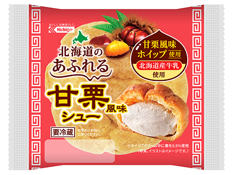 北海道産牛乳とマロンあん・甘栗の煎った香ばしさを出すための隠し味としてインスタントコーヒーを入れた甘栗風のホイップクリームを、北海道産小麦の小麦粉を使用したシュー皮にあふれるほど入れました。