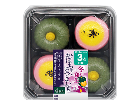 ”かぼちゃ”は草しんこ餅に粒あん入り。”さつまいも”は2色のすあま生地を使用。黄色生地はスイートポテト風味です。