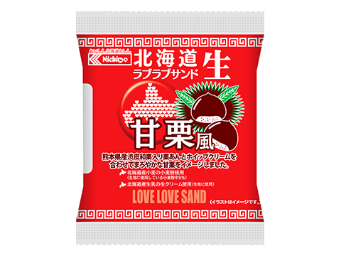 熊本県産渋皮和栗フィリングをサンド。生クリームのコクと洋酒の豊かな香りと、まろやかな甘さのホイップクリームとの甘栗風の甘い仕立て。