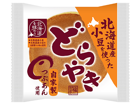 北海道産小麦の小麦粉と、みりんやはちみつ入りのしっとりどら皮に、北海道産小豆の自家製つぶあんを挟みました。北海道産原料にこだわったどら焼き。
