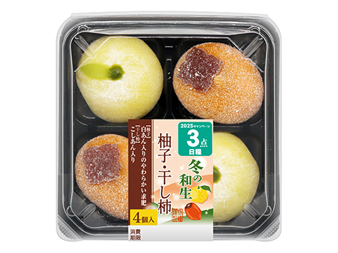 ”柚子”はほんのり黄色に色づけした求肥に白あん入り。”干し柿”は本物そっくりに仕立て、中にはこしあんが入っています。