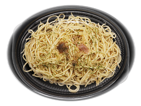 にんにくと赤とうがらしの効いたソースを絡め、3種類のきのことベーコンを炒めた具材をトッピングした大盛ペペロンチーノ。