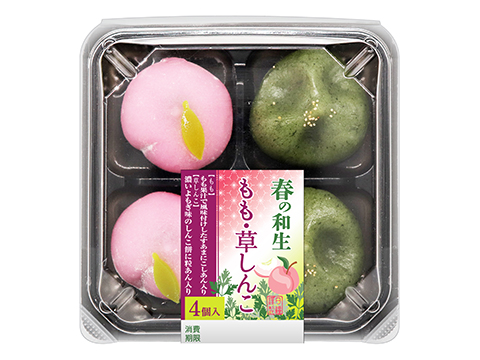 ももの瑞々しい香りを感じさせるももソース入りのすあま生地にこしあんを包み形を整え、羊羹で飾り付けした「もも」と、よもぎのすあま生地で粒あんを包んだ定番の「草しんこ」の詰合せ。