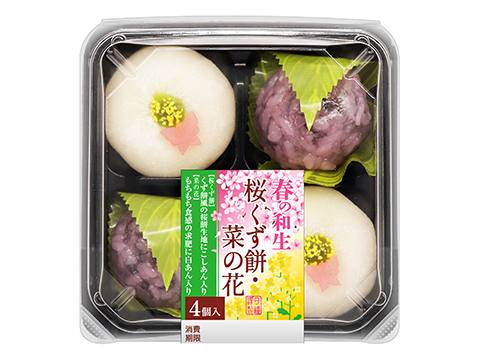 道明寺生地と葛生地を合わせた「桜くず餅」と、求肥生地で白あんを包み、上面に菜の花畑に蝶が舞う情景を表した「菜の花」の詰合せ。